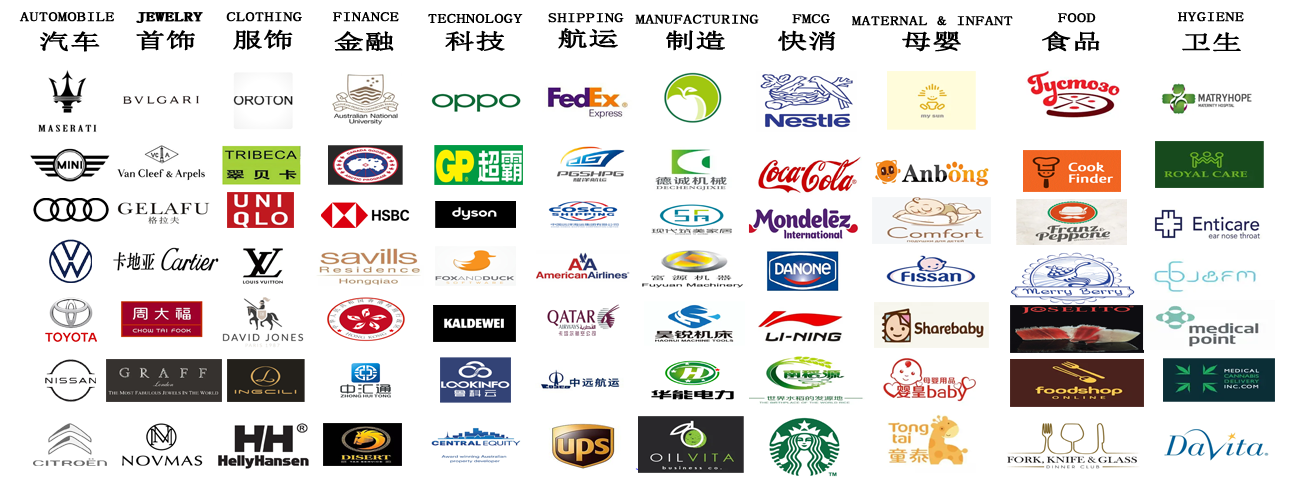 LVMH WATCH & JEWELLERY HONG KONG LIMITED 、NBN CO LIMITED 、GRAFF DIAMONDS BRANCHES BRANCHES LIMITED、ABASEEN ADMINISTRTION PTY LTD、UNIQLO HONG KONG LIMITED 、DAVID JONES PTY LIMITED、AUSTRALIAN NATIONAL UNIVERSITY、SAVILLS (SINGAPORE)OTE LIMITED、PROFESSIONAL AND PERSONAL CENTRAL EQUITY LIMITED、GIDGET FIYBDATUIB AYSTRAKUA、MEDIATEK GLOBAL BOLDINGS LIMITED、FEDERAL EXPRESS (HANG KONG)LIMITED、CANADA GOOSE HK LIMITED MACA U BRANCH、THE SEATCH GROUP (HANG KONG)、OROTONGROUP(AUSTRALIA )PTY LIMITED 、TIFFANY&Co.(Australia)PTY.lTD、 BULGARI AUSTRALIA PTY LIMITED、DYSON APPLIANCES (AUST.)PTY LIMITED、HSBC BANK COMPANY LIMITED、 东武铁道株式会社、卡塔尔航空集团公司北京代表处、凯的维(上海)贸易有限公司、香港特别行政区新闻处、花王(香港)有限公司 、超霸电池有限公司、周生生珠宝金行有限公司、翠贝卡零售管理有限公司 、梵克雅宝亚太有限公司 、JOSELITO 、CARTIER 、MASERATI 、LOUIS VUITTO 、OPPO、GRAFF etc.